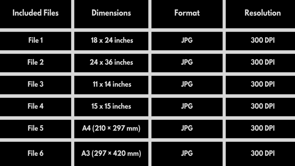✅ 6 High-Resolution JPEG files (300 DPI) for printing in the following. sizes: 18x24" 24x36" 15x15" 11x14" A4,A3 All files delivered in a ZIP folder for instant download after purchase. No physical item will be shipped. ⚠️ Note: Colors may vary slightly depending on monitor and printer settings. For personal use only please do not resell or redistribute.